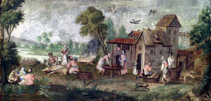 This scene of pig butchering in a village or castle farm setting is reminiscent of other engraved or painted scenes by artists such as Teniers, Ostade and Heyden, or as depicted in various Books of Hours.