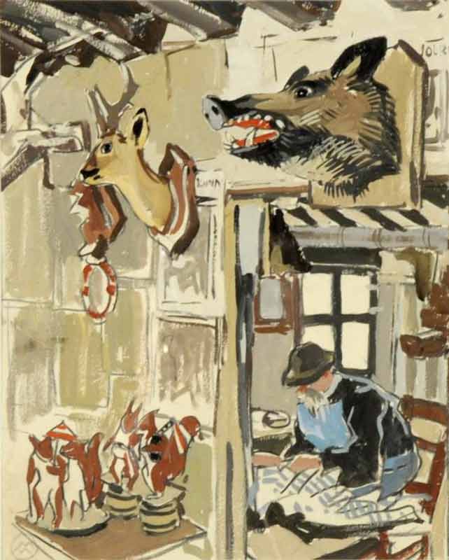 During the 1940s he taught at the École des Beaux-Arts de Rennes, served as decorator for the Institut de Géologie de Rennes, and completed his celebrated illustrations of Florian Le Roy’s Vieux Métiers Bretons. The Musée Mathurin Méheut in Lamballe, created in 1972, preserves his work. [DES-12/15]